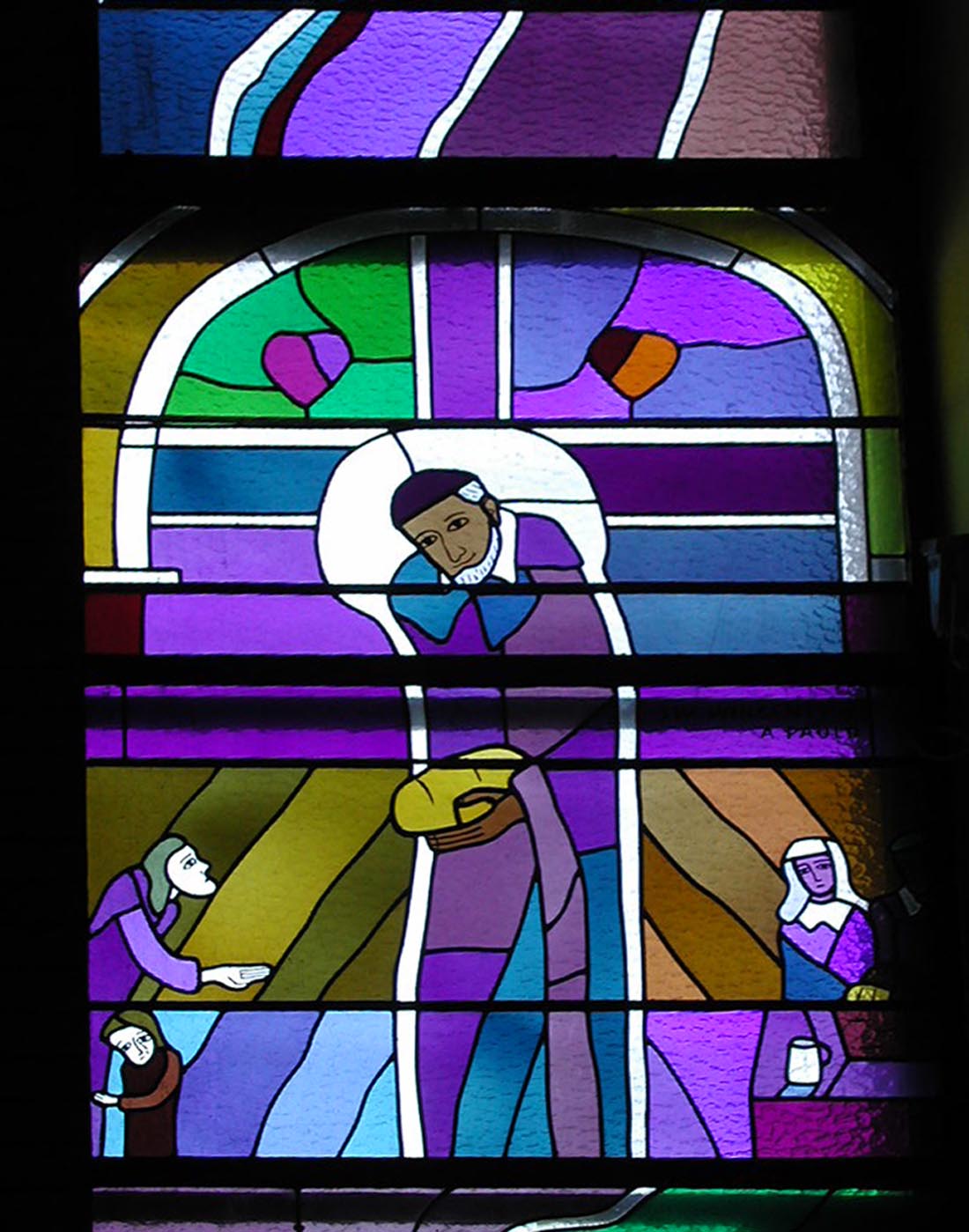 Vincent de Paul distributes bread to poor man, child; women preparing food. Original in Vincentian church of Blessed Aniela Salawa Krakow; designed by Teresa Stankiewicz.
