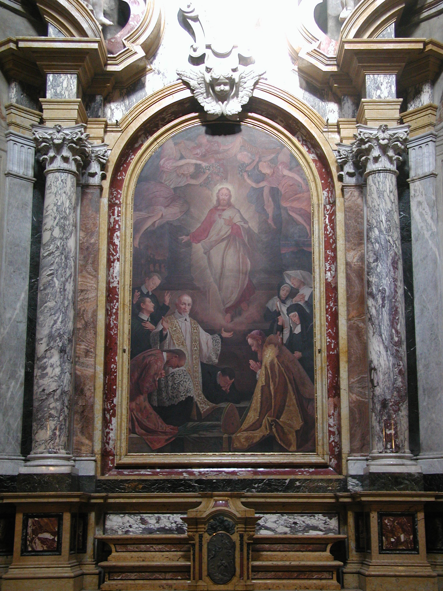 Oil on canvas, altarpiece; Vincent de Paul, kneeling, cassock, surplice, embroidered stole, presents Sacred Heart to Vincentians, Justin de Jacobis, JG Perboyre, and Sisters, with Louise de Marillac; original in Vincentian chapel