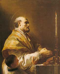 Vincent de Paul, gold vestments, halo, at Mass; altar server at his side. Probably vision of Three Globes. Internet image. Original unknown, presumably Italian; rare depiction of SVdP at Mass