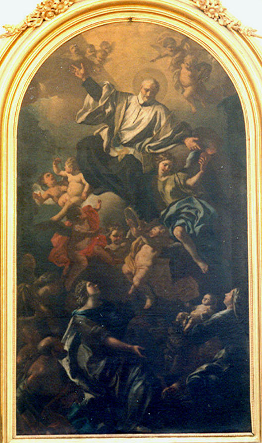 Framed oil on canvas, altarpiece; Vincent de Paul, cassock, surplice, stole, halo, seated on clouds, escorted by angels; poor persons below, woman with child; original in Vincentian house, Via Vergini; based on beatification model