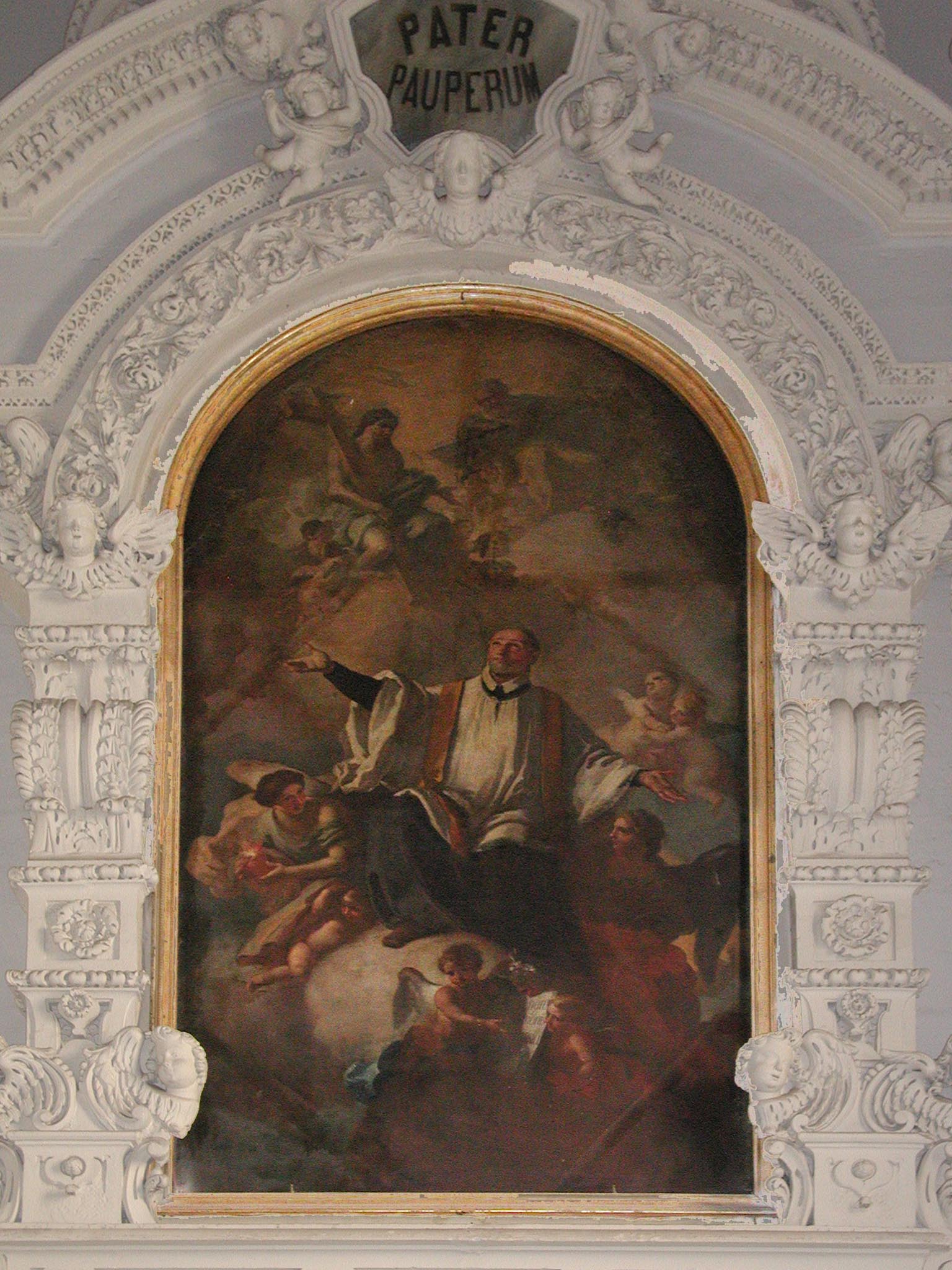 Altarpiece, framed painting; SV, seated on cloud; cassock, surplice, gold stole, dark hair; being raised to glory with Jesus, angels; original in Vincentian chapel, Lecce; based on beatification banner, Rome; artist: Tiso Oronzo, 1750; I colori della carità, p. 219