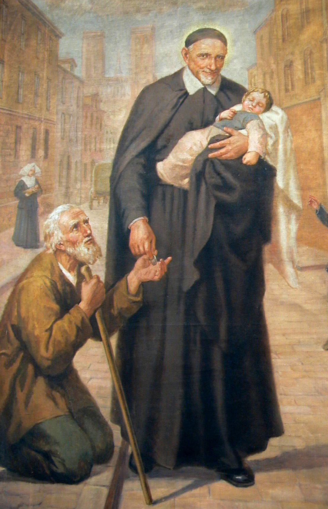Vincent de Paul, standing, cassock, cape, skullcap, holding sleeping child, giving alms to kneeling man; Daughter of Charity in background of city streets; original in Vincentian house, Udine