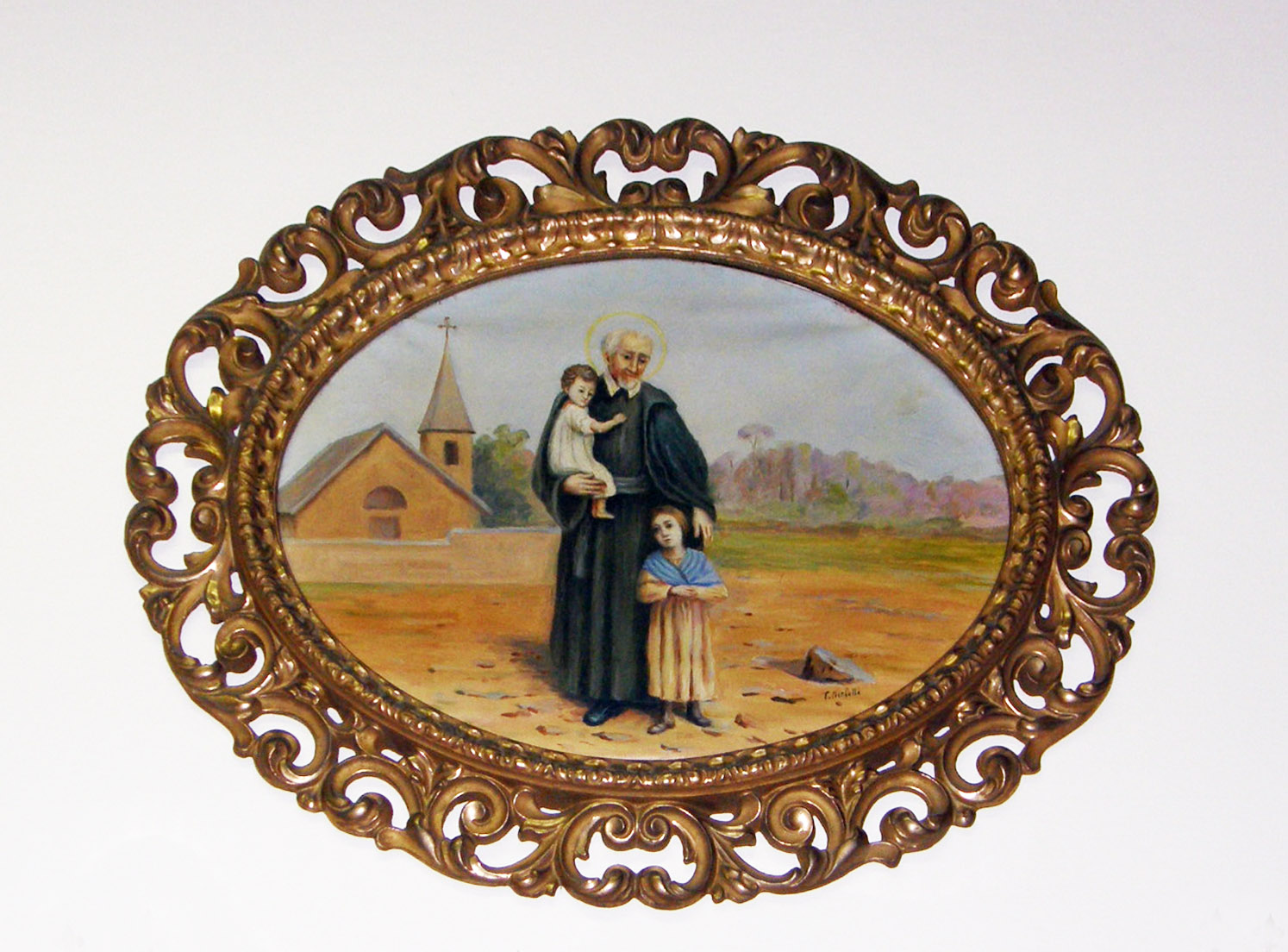 Framed oval painting; Vincent de Paul, standing, cassock, cincture, cape, halo; with two children; mountains, church in background; original in Daughters of Charity provincial house