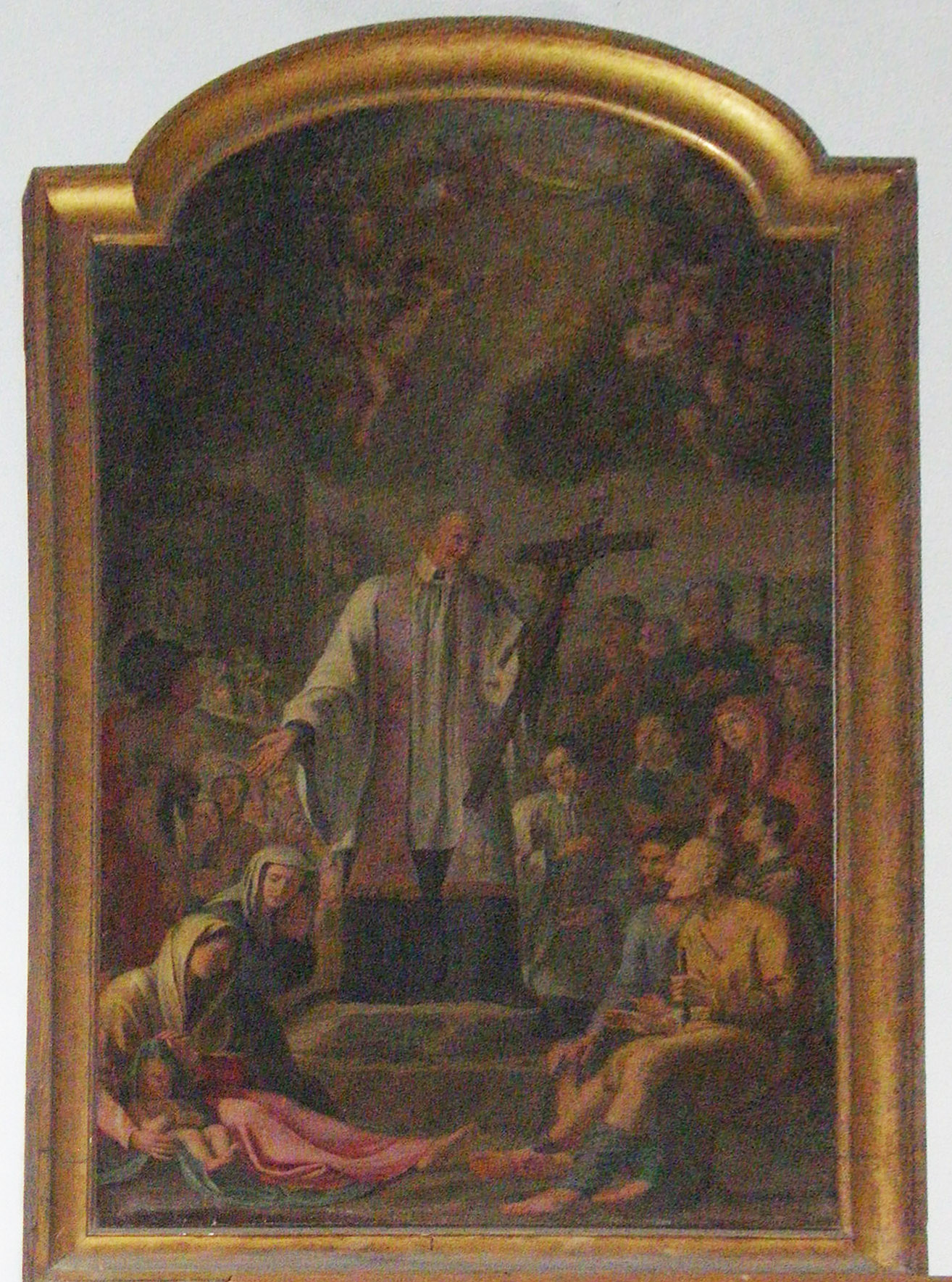 SVdP, standing, cassock, surplice, violet stole, holding crucifix; people in rural setting; standard Italian depiction; original in Vincentian chapel, Florence; removed from former Vincentian house, Florence; I colori della carità, p. 217