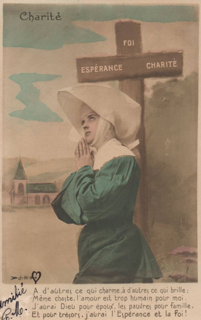 Text: For some, the charmer, for others, the brilliant; even chaste, love if too human for me. I will have God as my spouse, the poor my family, and for treasures, I will have hope and faith.