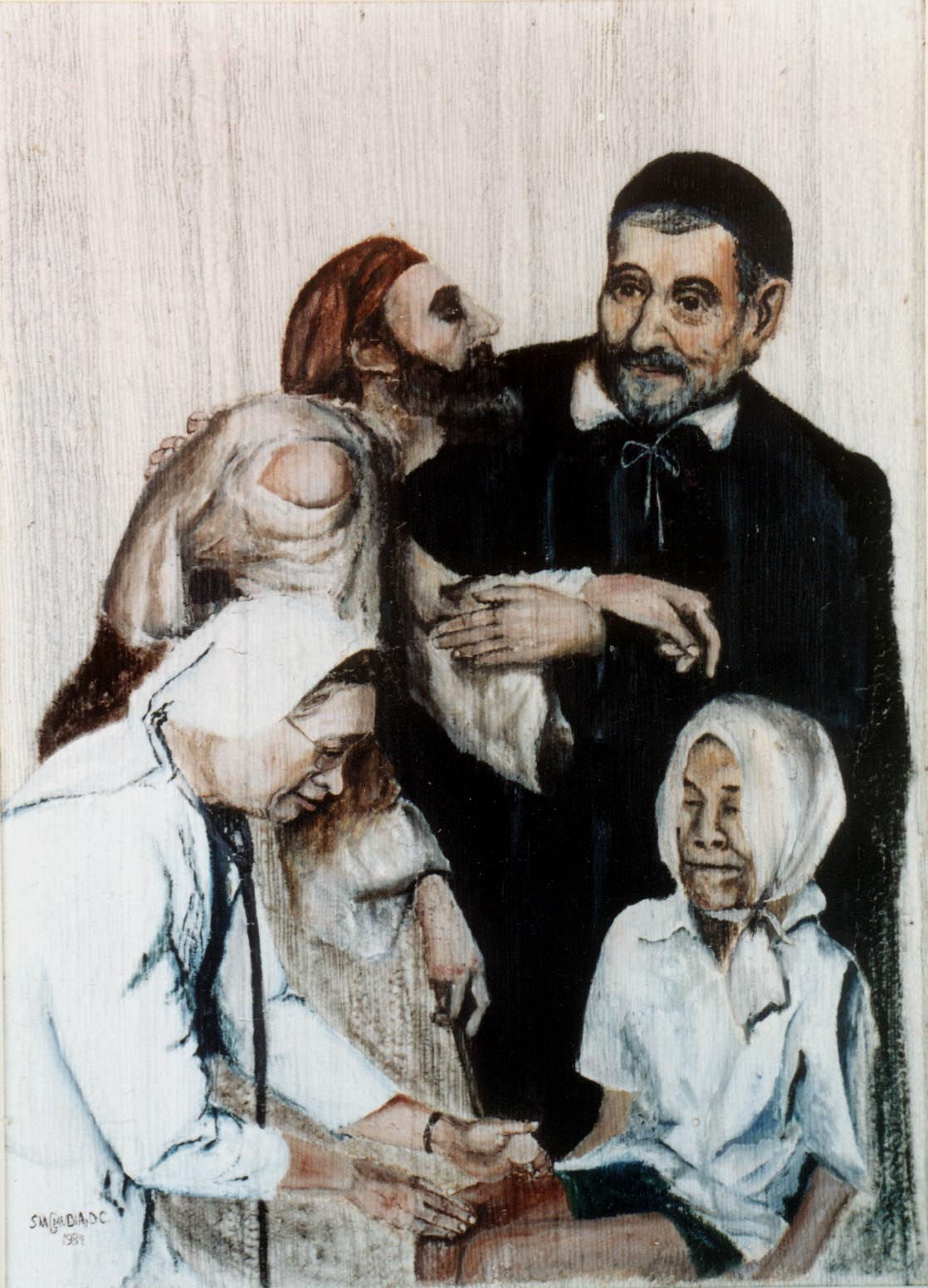 Vincent de Paul, standing, cassock, mantle, skullcap, comforting poor man, with Daughter of Charity nursing a poor woman, artist, Sr. Wissemann; location of original unknown