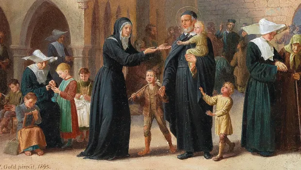 SVdP and Louise de Marillac, with children, Sisters; location of original not given