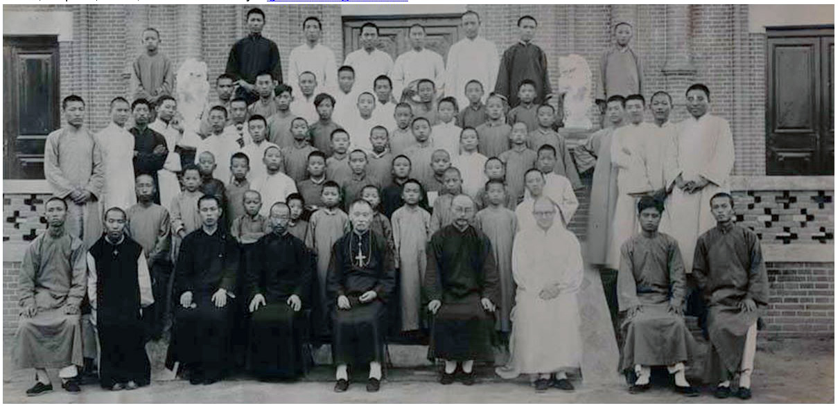 Minor seminarians, w/ bishop, seminary staff before cathedral, beginning of school year 1934-1935. Seated left to right: lay teacher, Little brother of St. John the Baptist Alexandre Ts’ao (Cao Lishan 曹立珊), Vincentian Father Jean Tcheou (Zhou 周), Vincentian Father Jean-Baptiste Wang (Wang Zengyi 王增義), Bishop Melchior Souen (Sun Dezhen 孫德楨), Fr. Raymond De Jaegher, two lay teachers