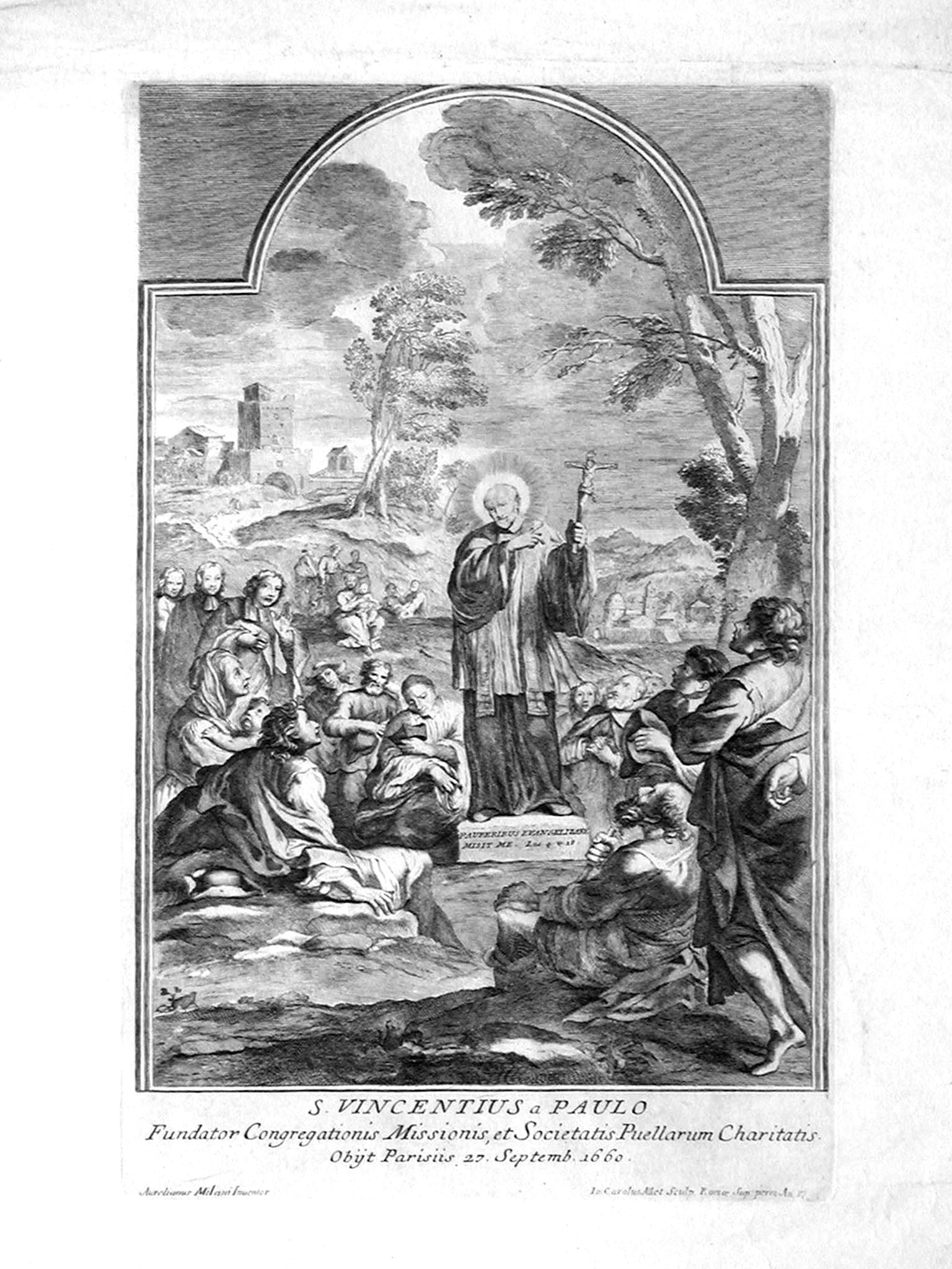 Engraving of painting, Vincent de Paul preaching in country area; produced in Rome probably for his canonization, 1737; original in Collegio Leoniano