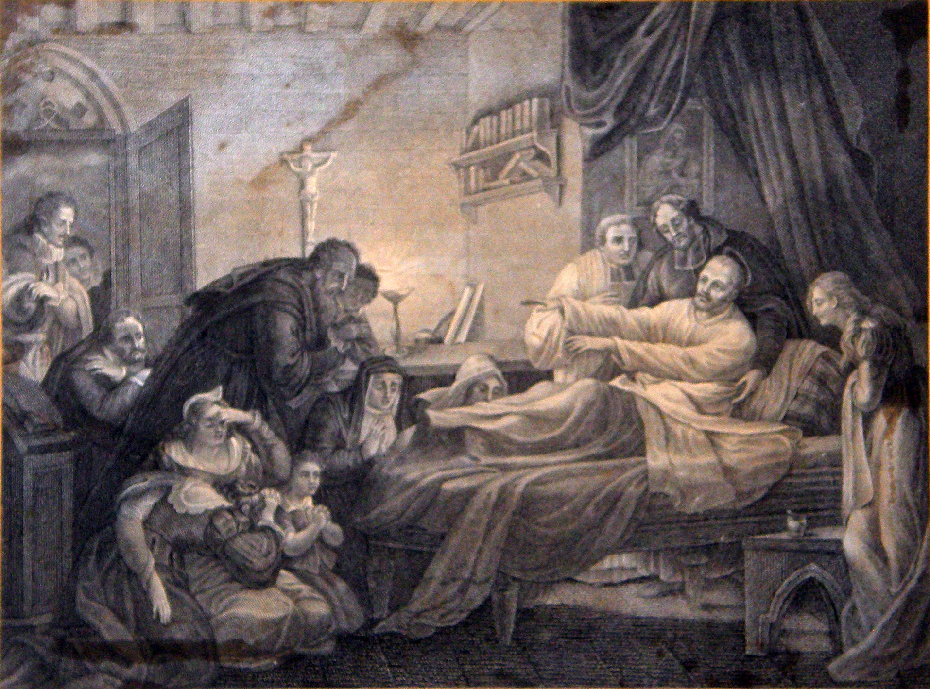 Death bed, Vincent de Paul; Louise de Marillac (already deceased), priests, Sisters, children, Ladies; original in provincial office, Turin