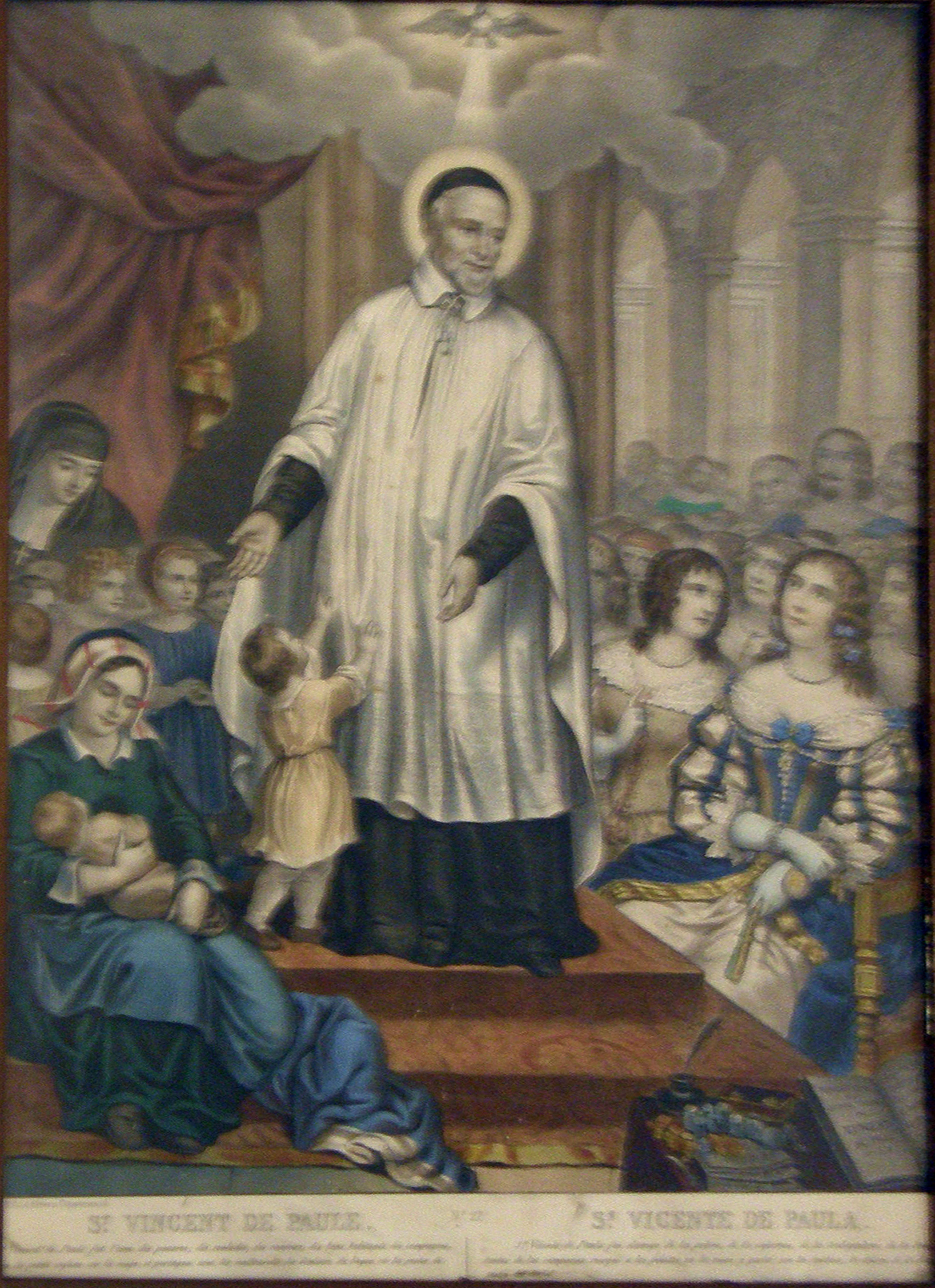 Vincent de Paul, standing, cassock, surplice, skullcap, halo; with Ladies of Charity, women with orphans; Sister in background; dove of Holy Spirit above; original in Vincentian provincial house