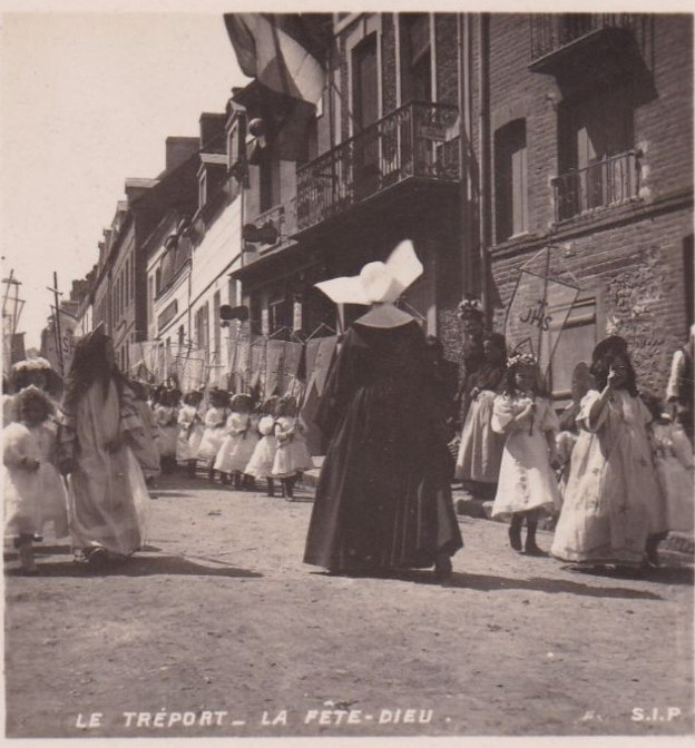 Girls in procession, banners, lights; date not given