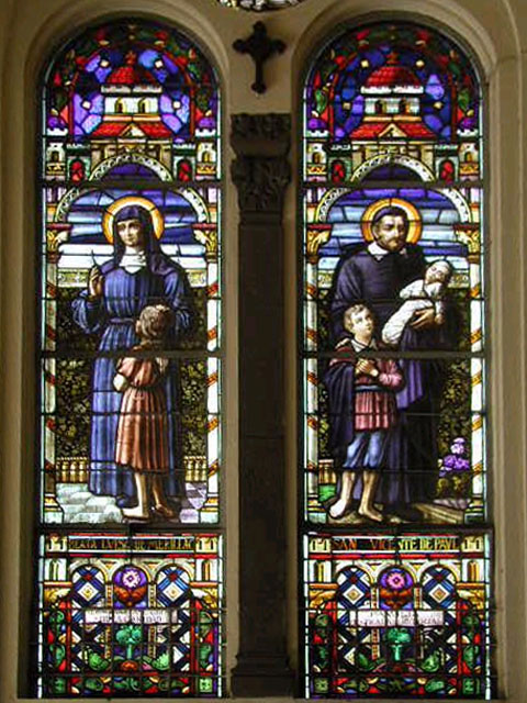 Vincent de Paul, traditional pose with two children; Louise de Marillac holding one girl. Names below in Spanish. Original in chapel, Casa provincial, Guatemala City