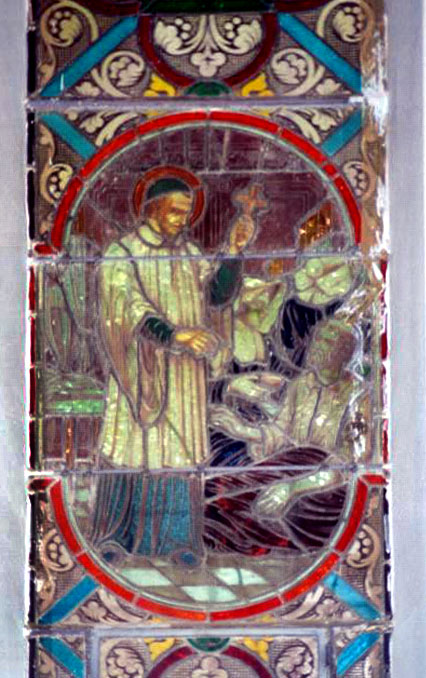 Vincent de Paul, holding crucifix, distributes alms (bread), to poor man; Daughters of Charity in background. Original in bishop's house, Algiers