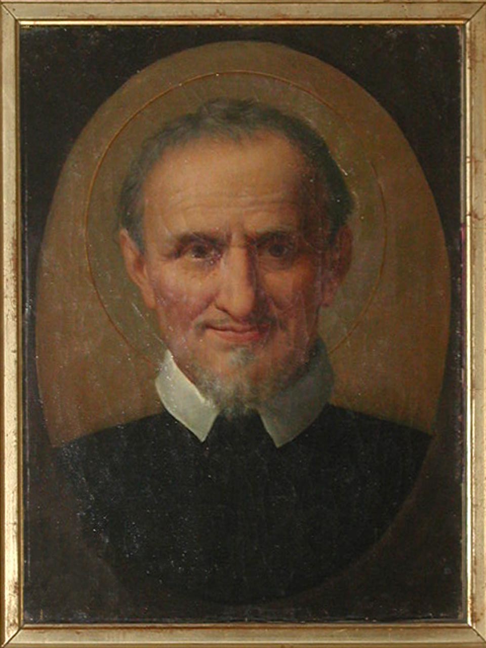 Framed oil painting, oval; Vincent de Paul, cassock, looking at viewer; halo, no head covering; Original in Vincentian country house, Ischia