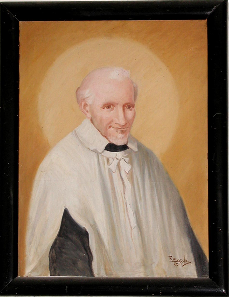 Framed oil painting; Vincent de Paul, cassock, surplice, no headcovering; half-figure; halo; gold background; original in Vincentian provincial house, Via Vergini, Naples