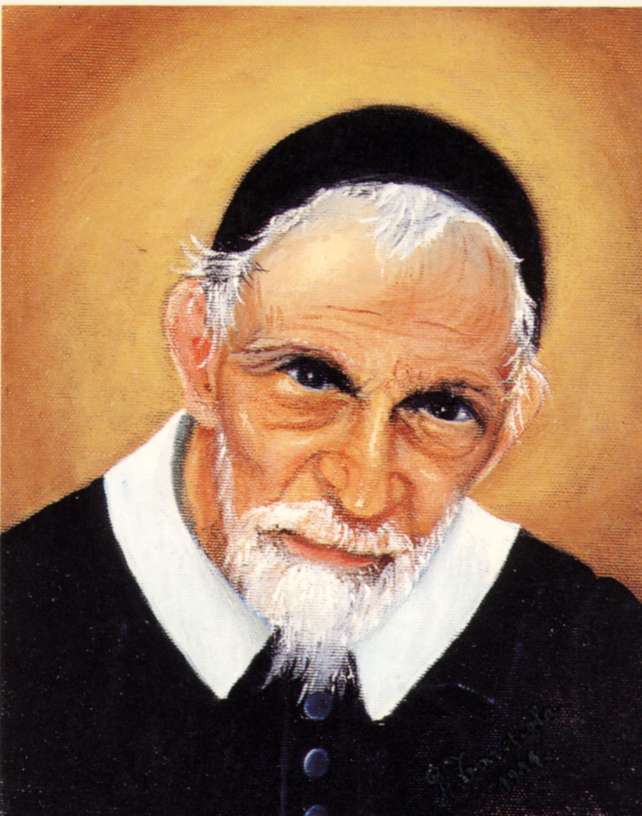 Oil painting, signed, dated; Vincent de Paul, cassock, blue buttons, skullcap; orange background; original with Daughters of Charity, Siena; artist, Sr. Giuseppina Tardiola, 1991, using traits of her brother, Vincenzo Tardiola, CM.