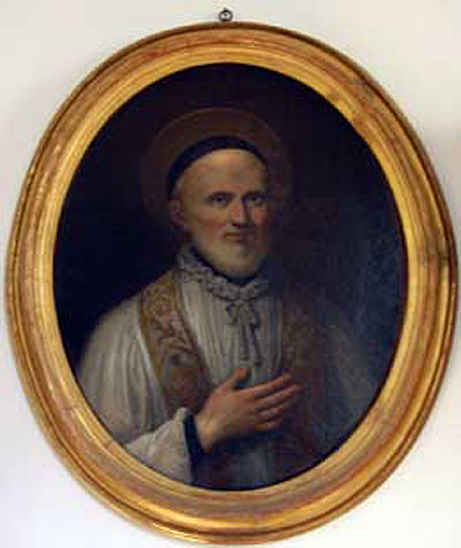 Vincent de Paul, cassock, surplice with ruffled collar, ties; brocade stole, skullcap, halo; oval frame; location of original unknown; internet image