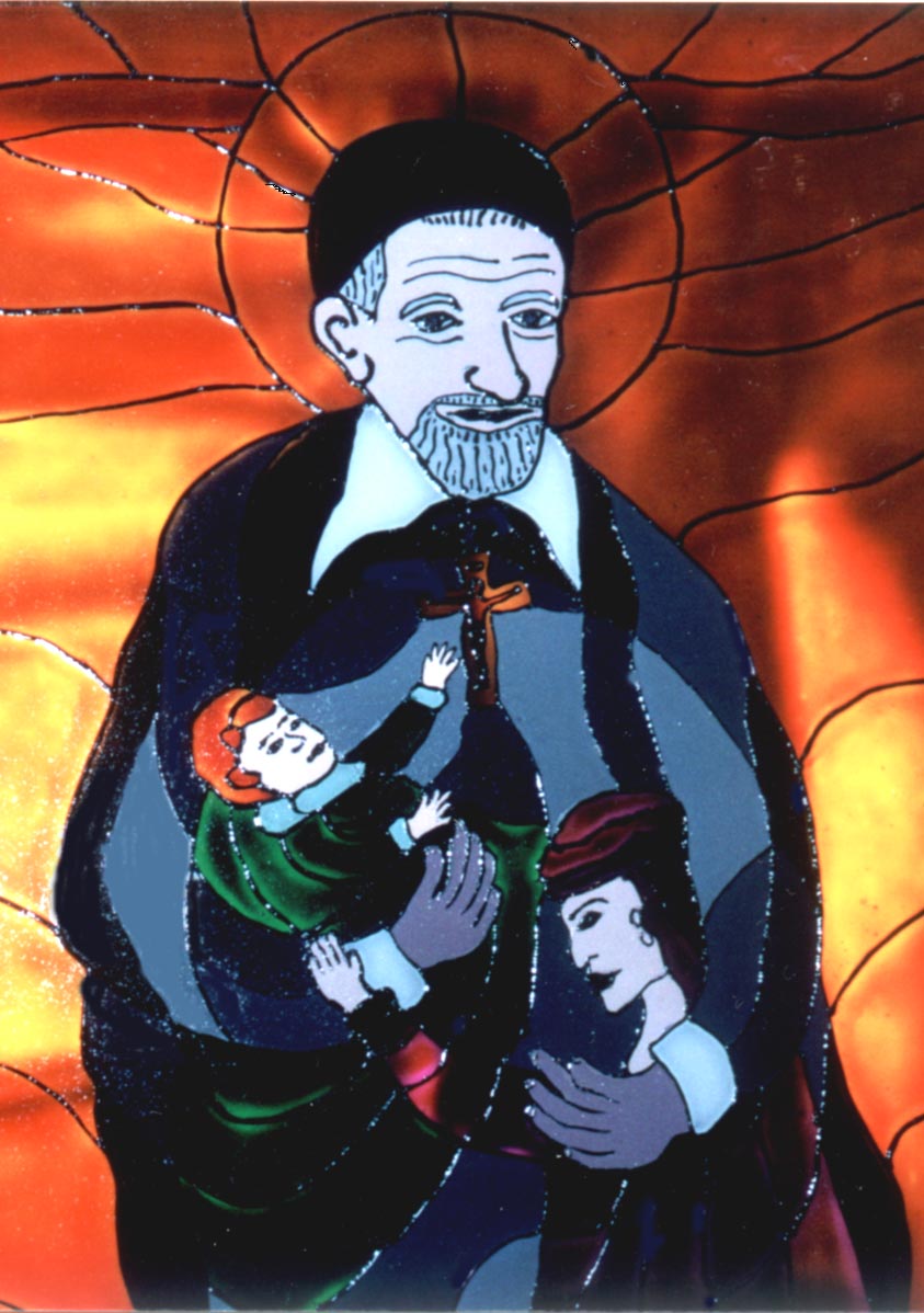 Vincent de Paul with two children; similar style, same artist as window from Thessalonika
