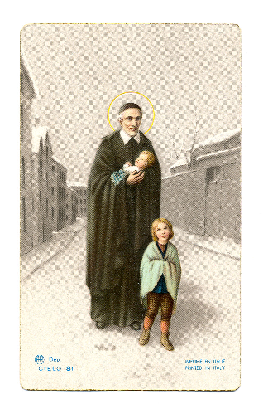 Vincent de Paul, standing, cassock, cape, skullcap, halo; two children; snow scene