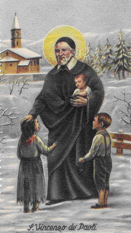 Vincent de Paul, standing, cassock, cape, skullcap, halo; exterior, with snow, church, conifers; three children; original in Daughters of Charity provincial archive, Turin