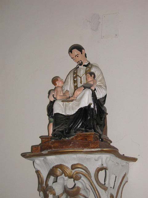 Painted plaster statue; Vincent de Paul, cassock, surplice, stole, seated with two children; based on Paris, St. Sulpice model; original in Vincentian house, Vergini, Naples