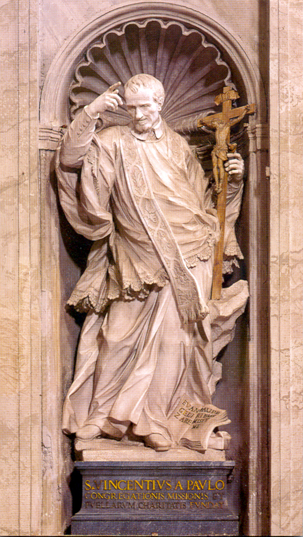 Marble, VdP, cassock, surplice, stole, holding crucifix; book and biretta at his feet, with Gospel text, "He has sent me to preach the Gospel to the poor;" by Pietro Bracci; in St. Peter's, Vatican City; sculpted 1750-53; erected 1754
