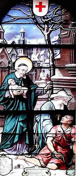 Vincent de Paul, standing, cassock, mantle, skullcap, halo; holding child; Daughter of Charity helping handicapped prisoner, with chains; snow scene with buildings; location of original unknown