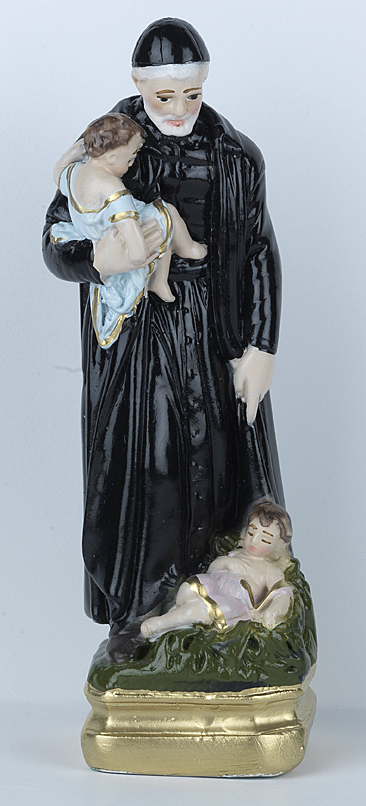 Vincent de Paul, standing, cassock, mantle, cincture, skullcap, grey hair; two infants in outdoor setting; commercial statue, internet image