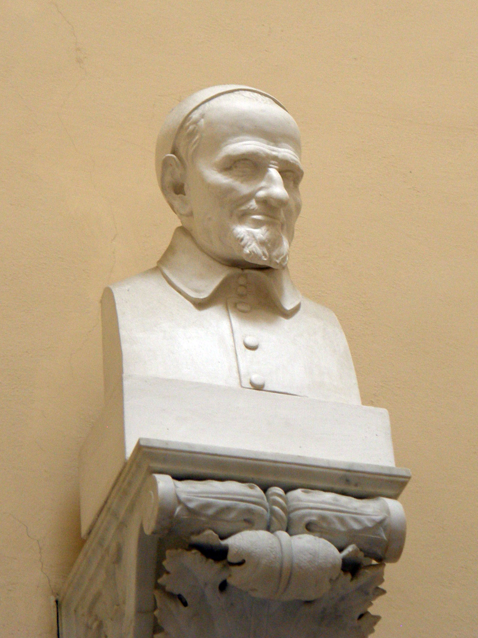 Marble bust, Vincent de Paul, cassock (large buttons), skullcap; in Vincentian house, Siena