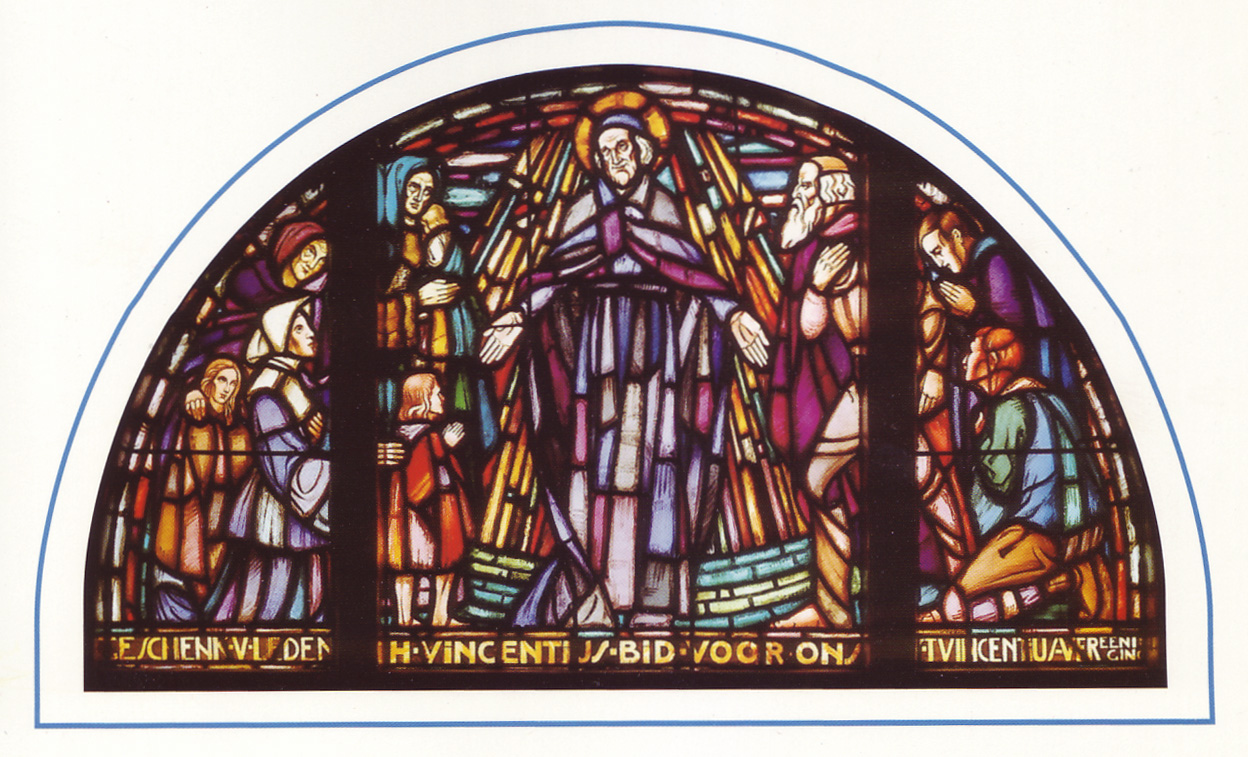 Half circle, Vincent de Paul, with rays behind, blesses works of charity, Daughter of Charity kneeling at right : center text: St. Vincent, pray for us; original in St.Anthony of Padua Ch., Tilburg; installed 1928; artist: August Hermans