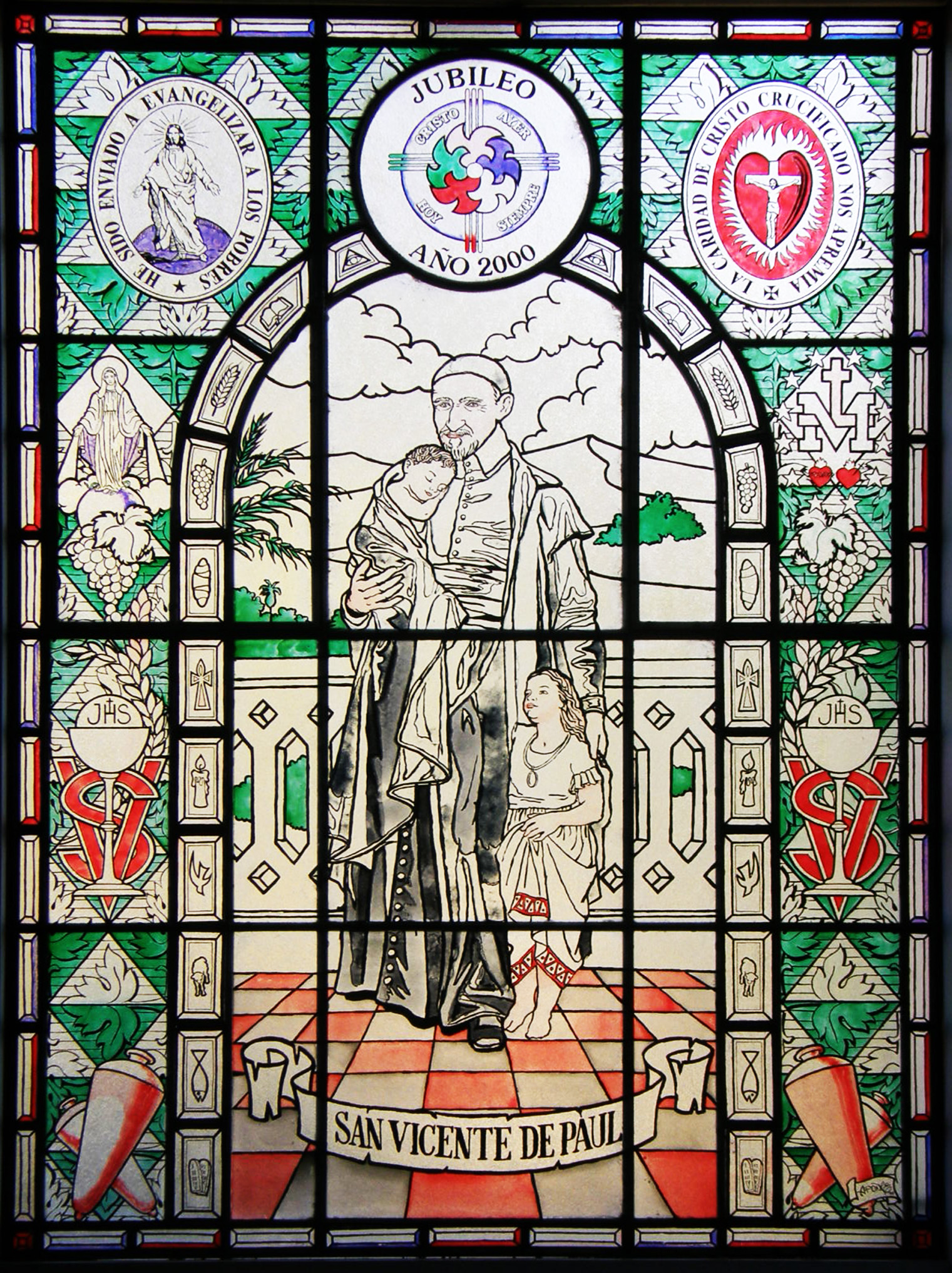 Vincent de Paul with children, emblems and mottos of Congregation of the Mission, Daughters of Charity, Miraculous Medal; in Vincentian community chapel, Ica; painted glass
