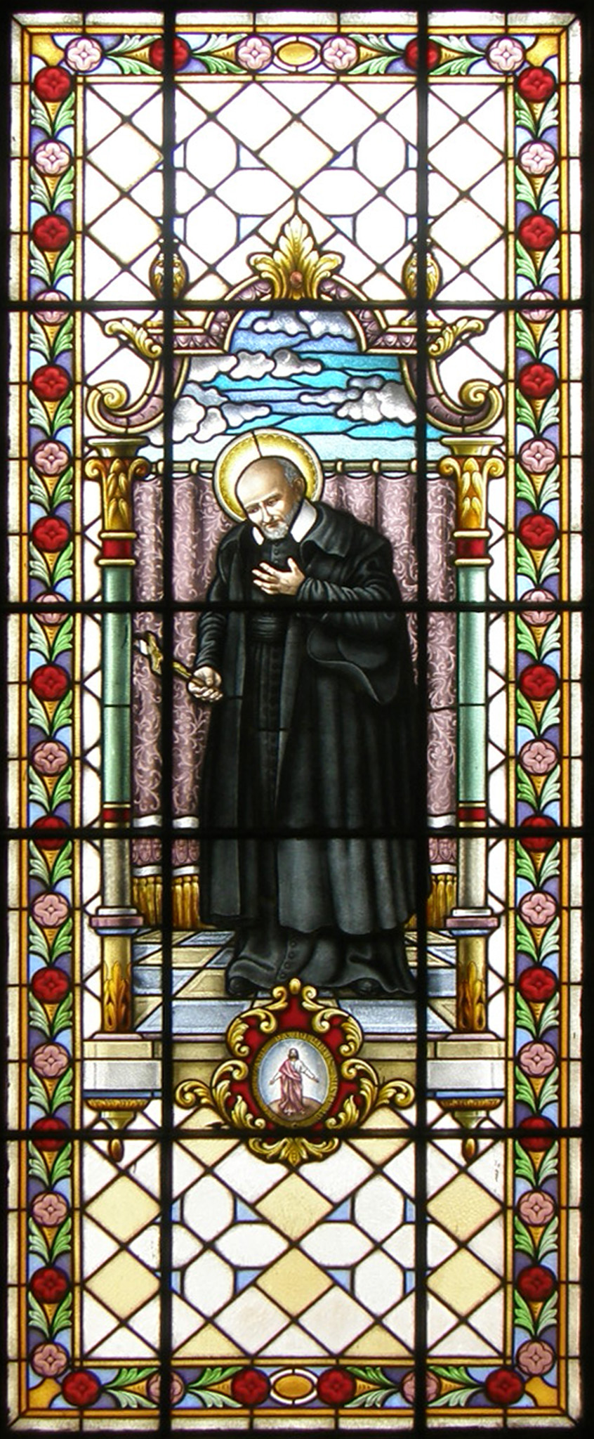 Vincent de Paul, standing, long cassock, mantle, contemplating crucifix in his right hand; emblem of Congregation of the Mission below; original in Vincentian community house, Lima