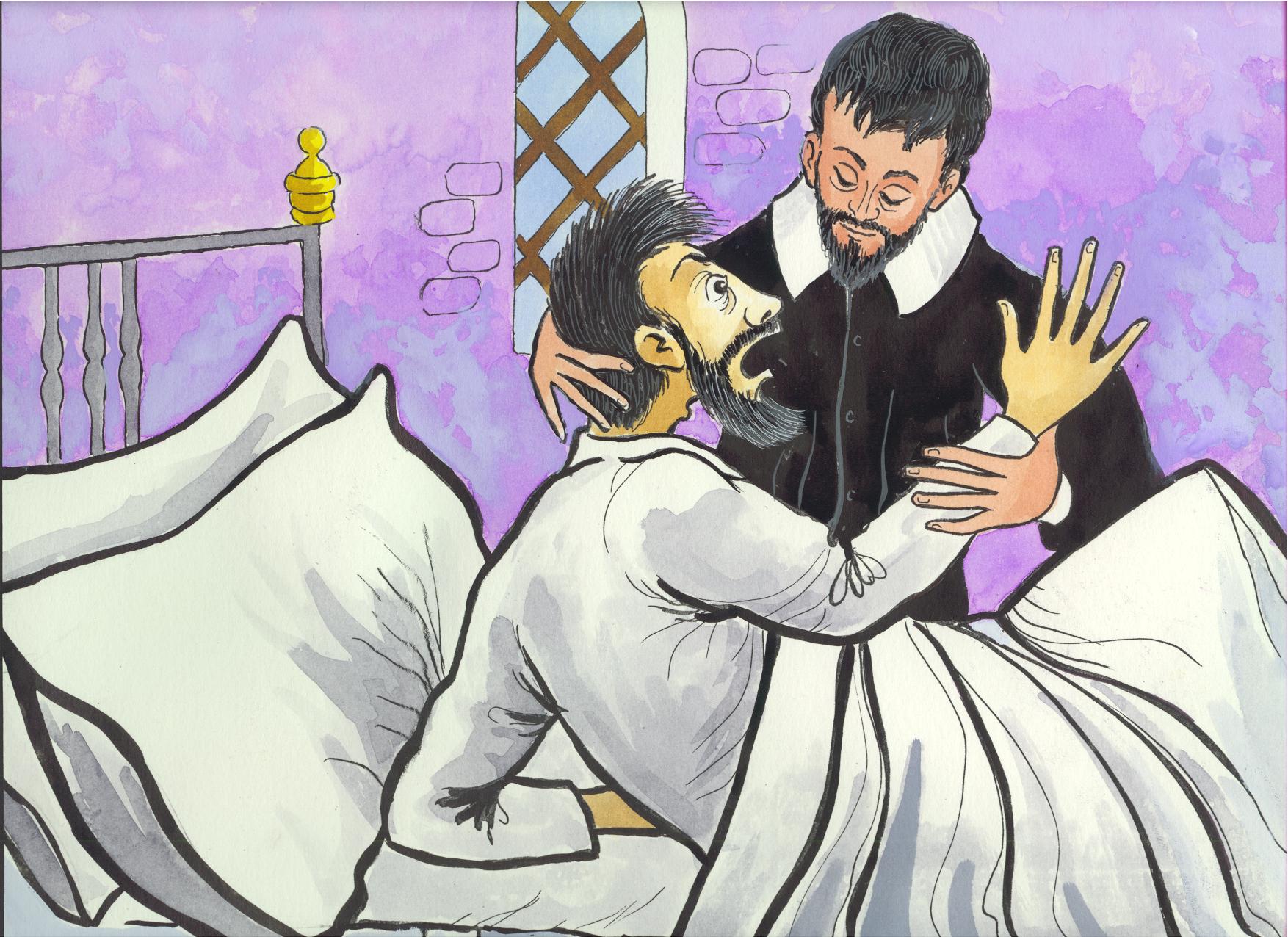 Vincent de Paul hears confession of sick man at Gannes