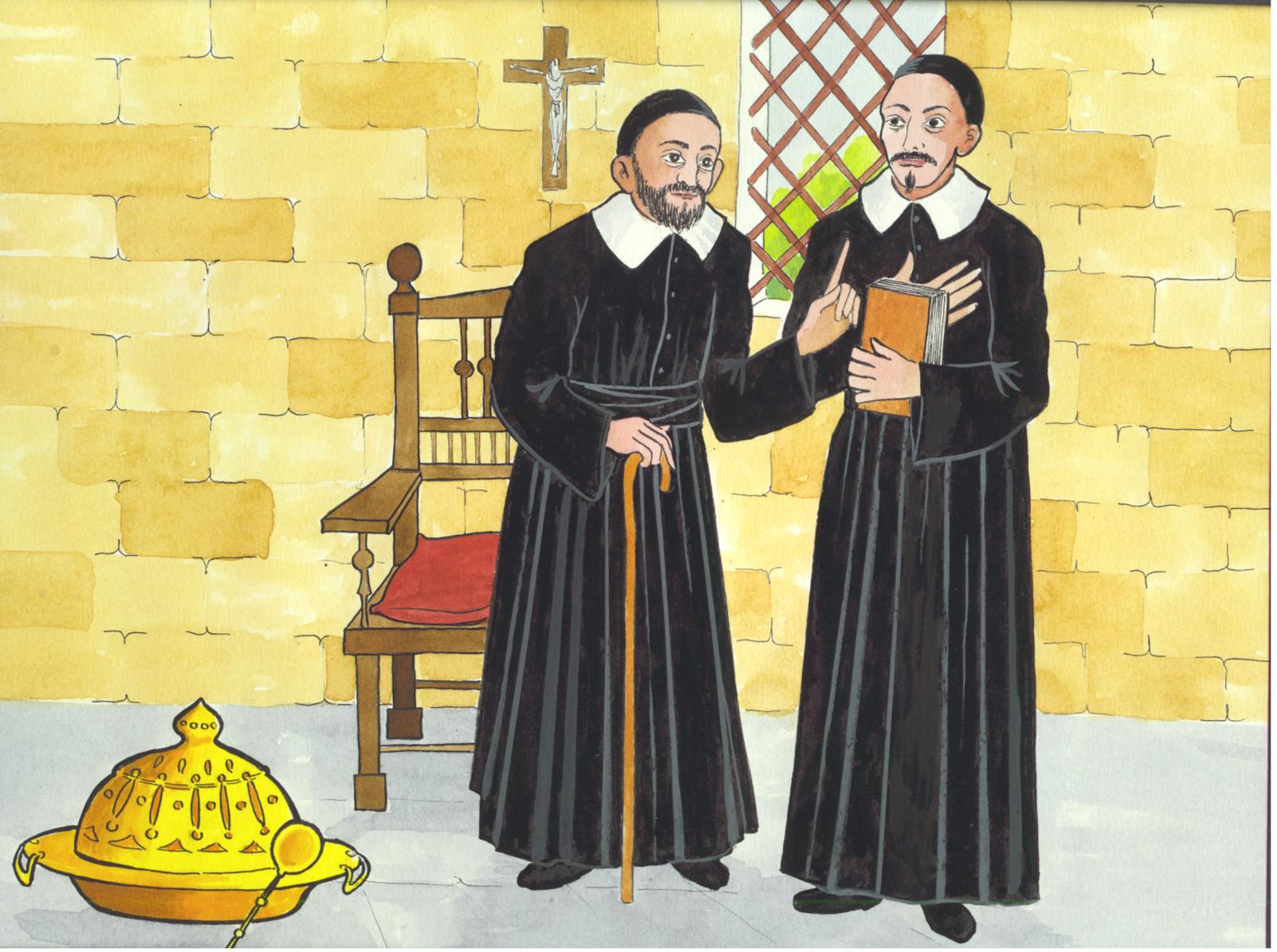Vincent de Paul, holding cane, with René Alméras; brazier on floor