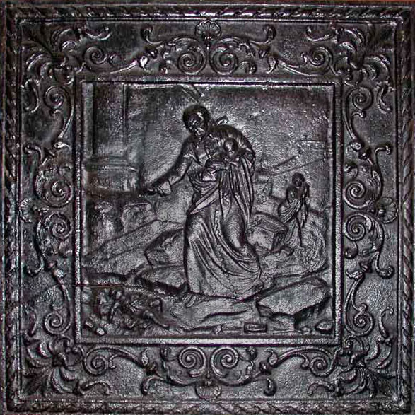 Cast iron fireplace screen, typical depiction of Vincent de Paul looking for abandoned children; in a frame surrounded by garlands and tendrils. In Archives de la Mission, Paris. 19th century.