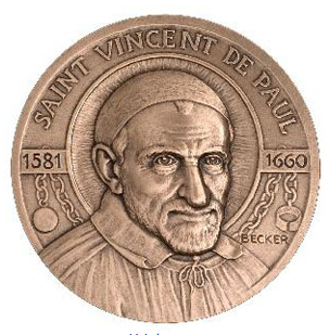 Obverse, bronze medallion; Vincent de Paul bust, cassock, surplice, skullcap; chains of galley prisoner; signed Becker; original in Vincentian mother house, Paris; made for 1960 tercentenary, Monnaie de Paris