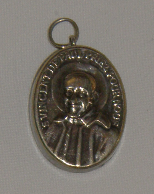 Oval silver or plated medal, with loop, ring; French text: Pray for us; original in Daughters of Charity provincial house, Turin