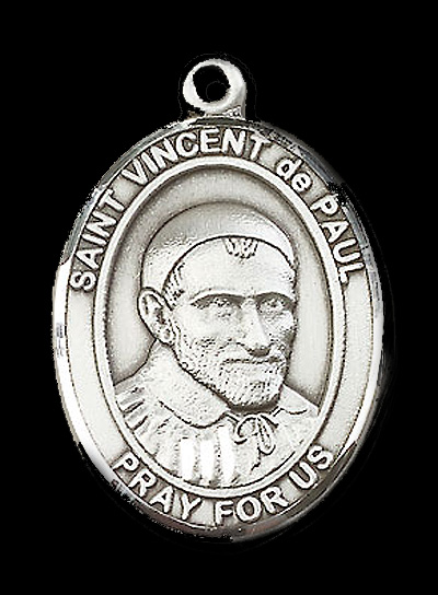 Nickel plated oval medal with loop; Vincent de Paul, cassock, surplice, skullcap, English text; internet image, sculptor, Bliss