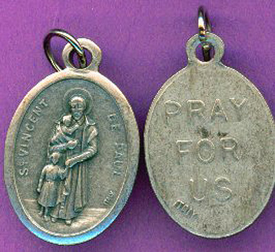 Nickel plated oval medal, with loop, ring; Vincent de Paul, standing, cassock, mantle, skullcap, halo, with two children; English text, Italian manufacture; internet image