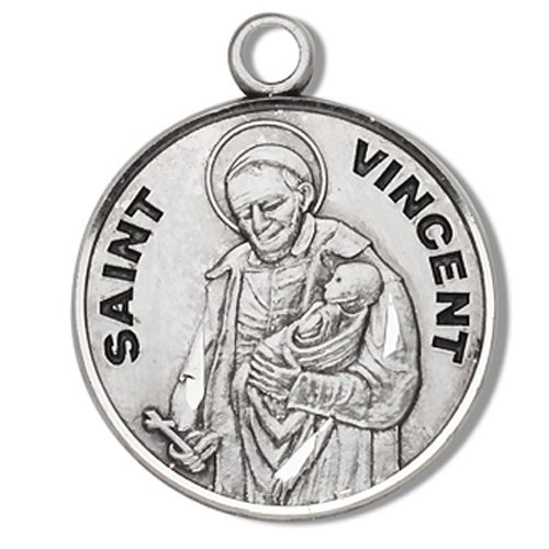 Round medal, loop; Vincent de Paul, standing, cassock, mantle, skullcap, halo; contemplating crucifix, holding child; internet image