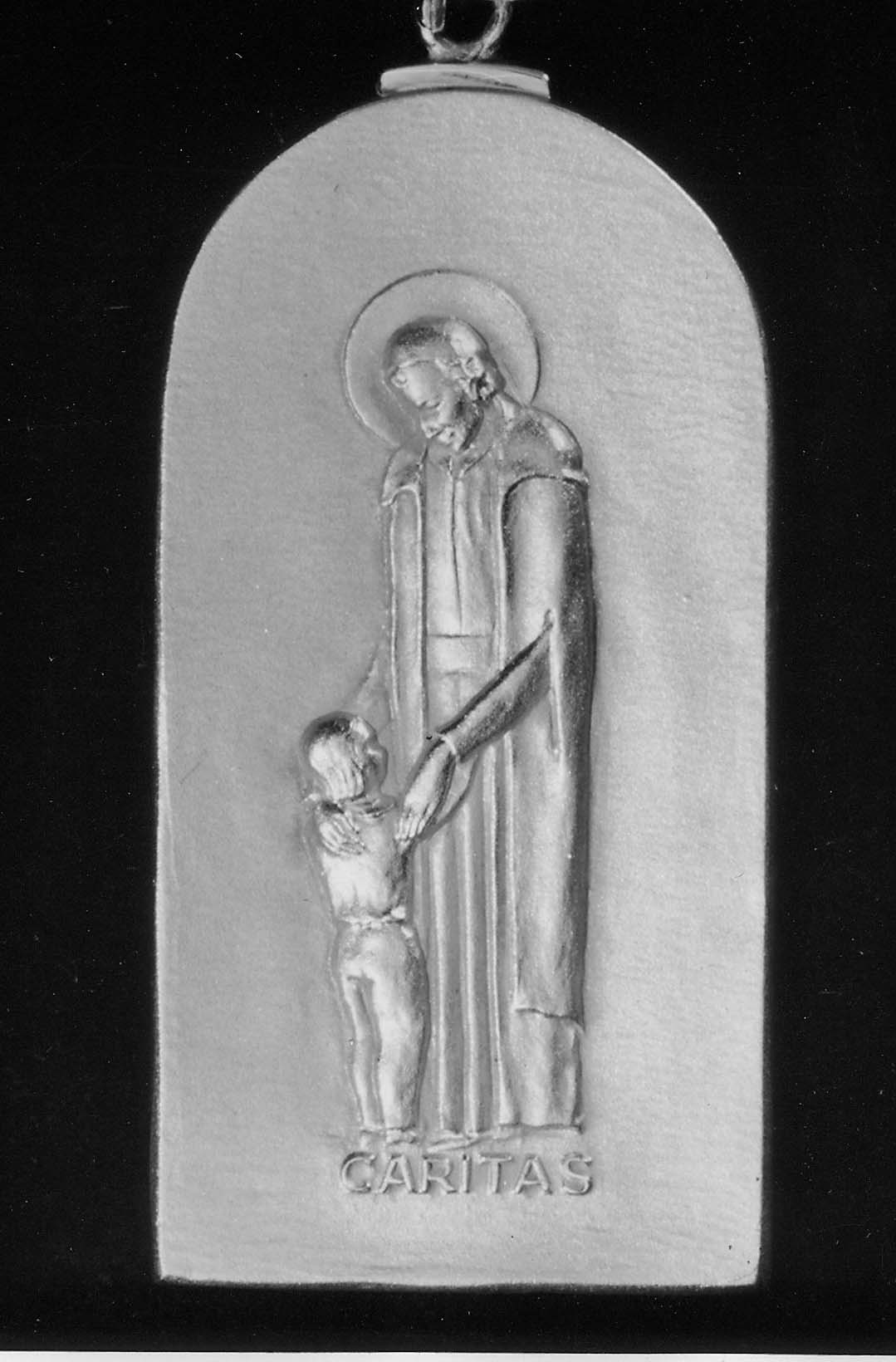 B&W photograph, Vincent de Paul medal, with Latin: Caritas, Charity; made for St. John's University, Jamaica, NY