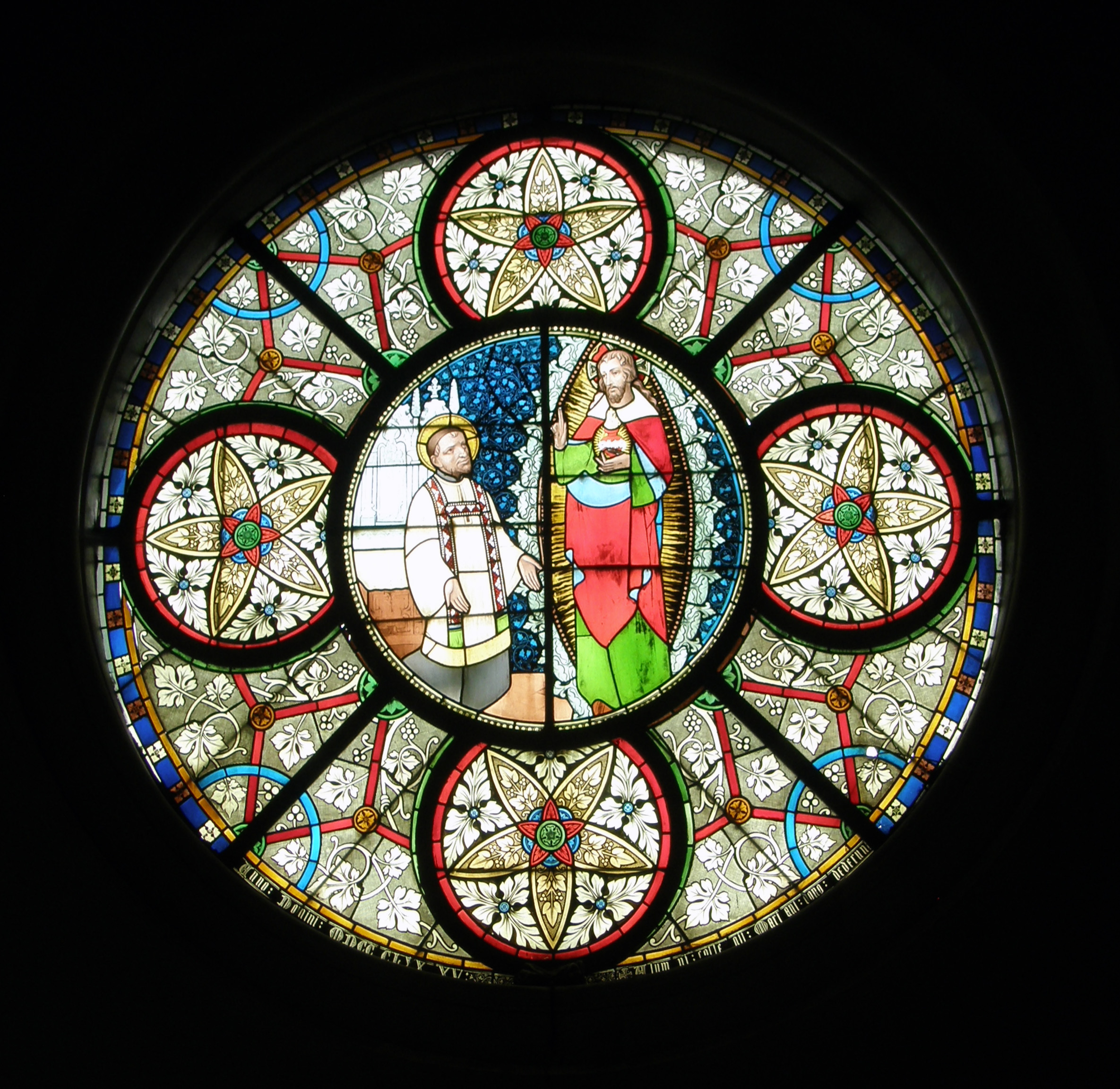 Vincent de Paul, cassock, surplice, stole, skullcap, halo; kneeling before Jesus; in chapel of former Collegium Marianum, of German province in exile in Theux, Belgium