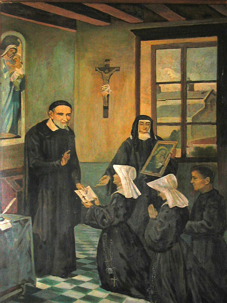 Painting; Vincent de Paul, standing, cassock, mantle, skullcap; giving Rules to Daughters of Charity (in Spanish habit); Louise de Marillac in background; portrait of priest, kneeling; original in Vincentian house, Manila