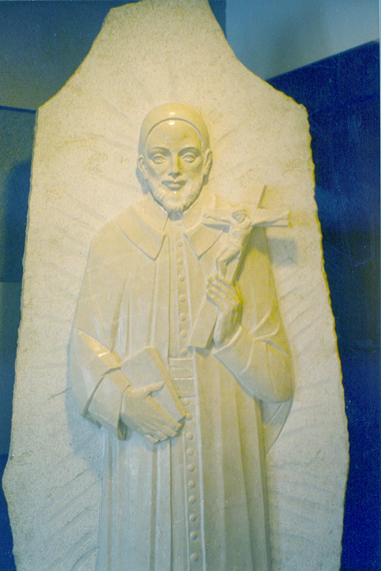 Carved marble, Vincent de Paul with crucifix and book. Detail of original in Ascension Health, St. Louis