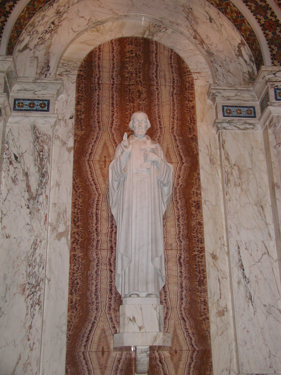 Carved marble statue, Vincent de Paul with cross, hand raised in blessing. Original in new cathedral, St. Louis