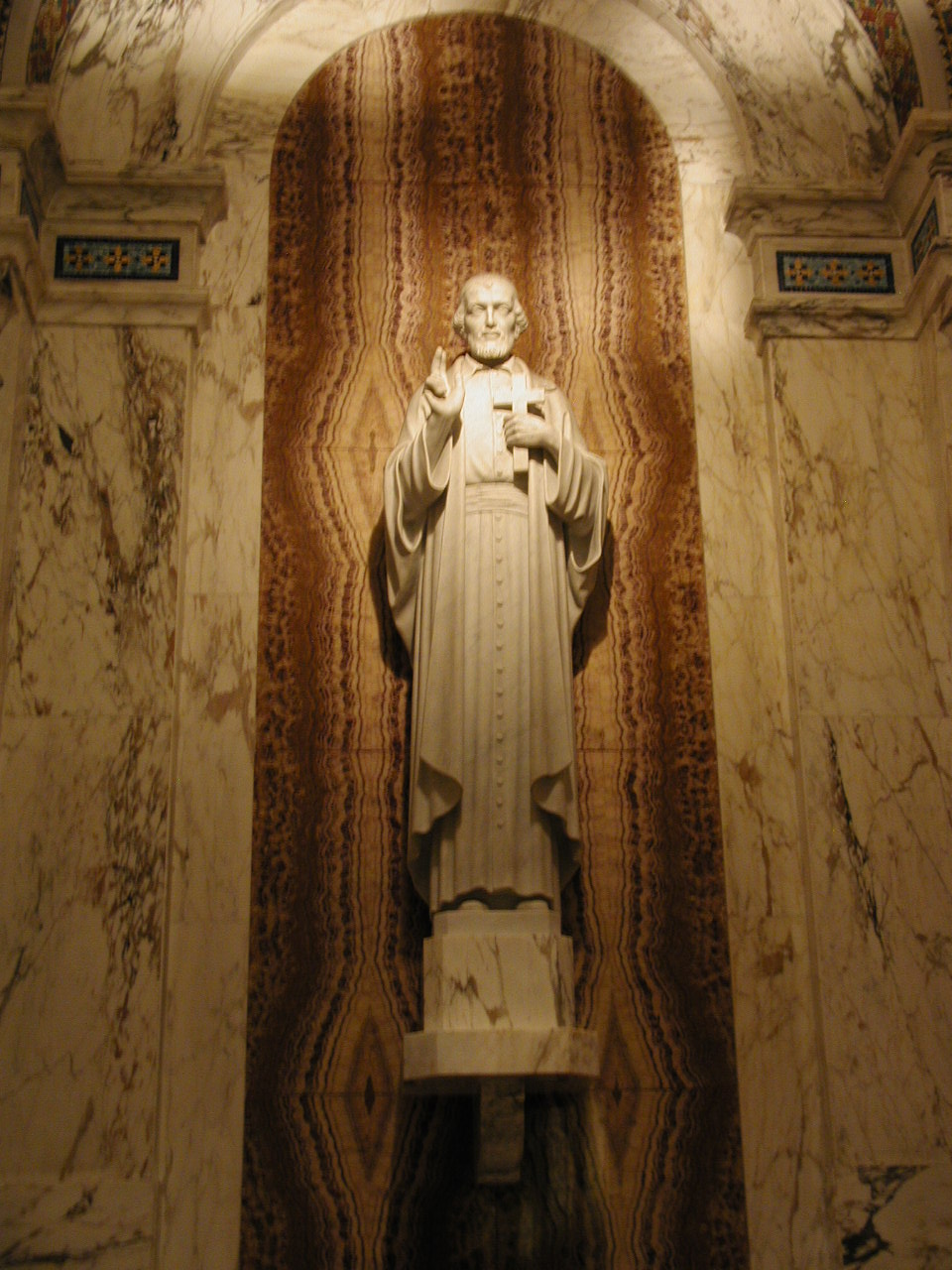Carved marble statue, Vincent de Paul, cassock and cape, holding cross, hand raised in blessing gesture; original in new cathedral, St. Louis