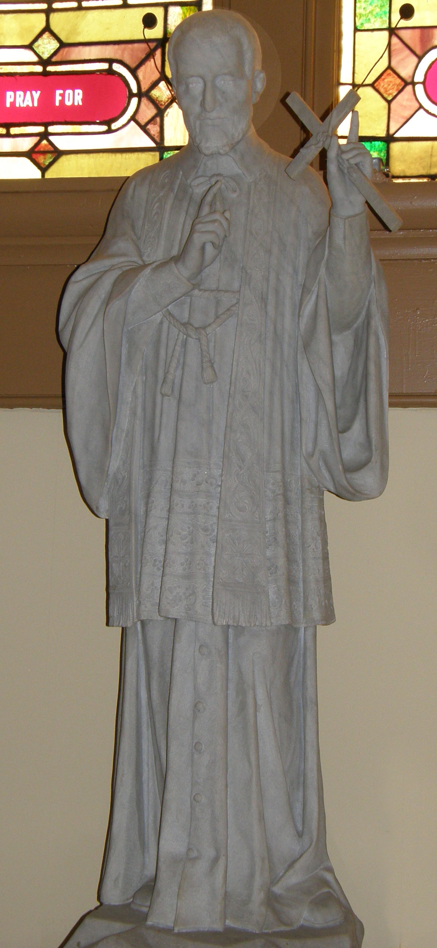 Marble, Vincent de Paul, standing, cassock, surplice, stole, gesturing toward crucifix; original in St. Vincent's church, St. Louis