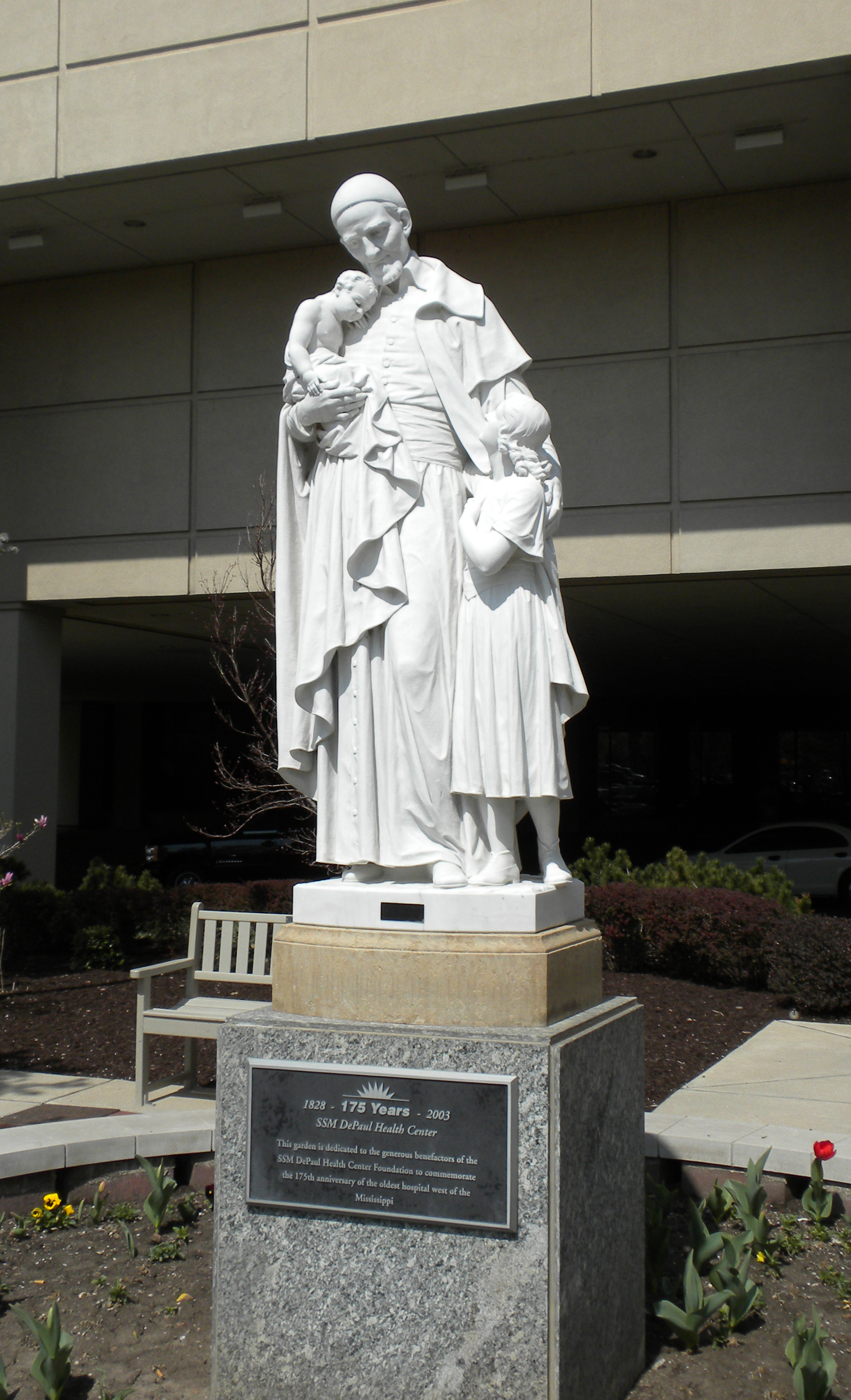 Marble statue, Vincent de Paul standing, cassock, wide cincture, mantle, skullcap, with sleeping child in his right arm, a girl standing; original at DePaul Health Center, commemorative plaque; photo, L. Asma, CM
