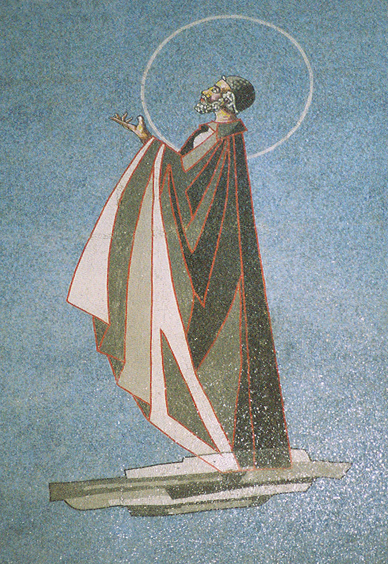 Mosaic; Vincent de Paul, standing, ample cape, skullcap, large halo; gesture of prayer; for Society of St. Vincent de Paul, Madrid